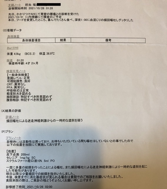 しかしながら、その翌々日の深夜には血交じりの頻回嘔吐による迷走神経刺激により一時的な虚脱を起こしました。救急病院で点滴などの応急処置をしていただきどうにか安定しました。