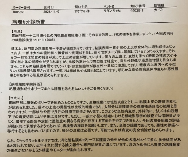 それから1週間後ようやく病理検査の結果が届き、大部分で非腫瘍性の腺腫様過形成の範疇であるが一部はやや蜜で良性の腺腫の可能性があるとの診断でした、良性ではあるが、はやり手術のリスクが高いので化学療法など考えられる治療方法について説明を受けることになりました。ただし、化学療法では根本的な治療にはならず胃幽門にあるポリープが壁になるため嘔吐が続く可能性があるというのです。このようなことから、今後の治療について非常に難しい判断を検討することになりました。