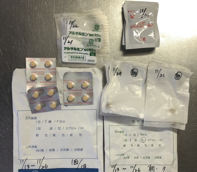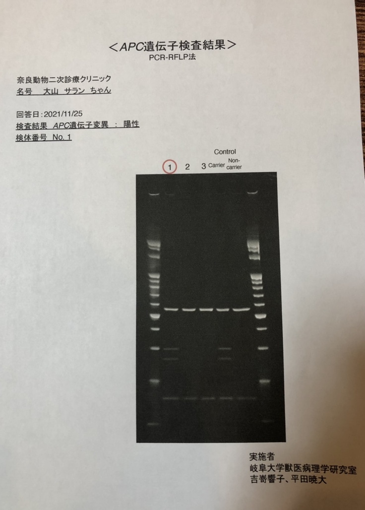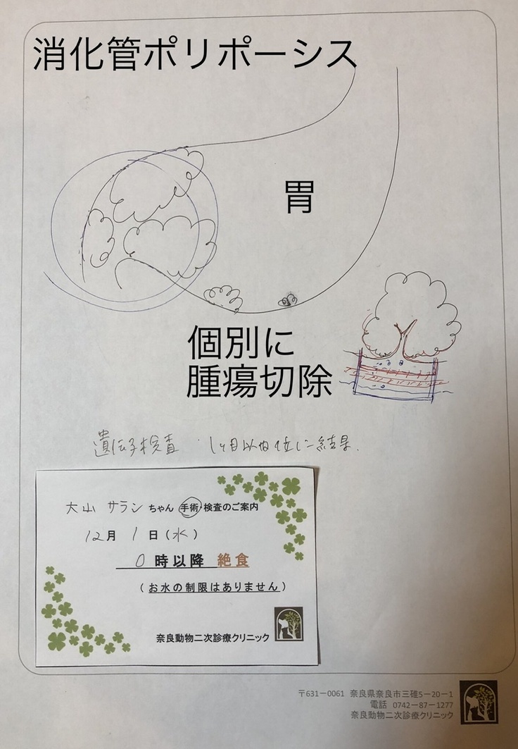 メールでご相談をさせていただくと、岐阜大学の先生からすぐにお返事をいただいた上、主治医と直接コンタクトまで取ってくださいました。結果、関西でこの病気を研究されているという先生が勤務されている奈良動物二次診療クリニックをご紹介頂きました。やはり、遺伝病である可能性が高く遺伝子検査を行っていただくことになりました。先生の診断ではおそらく消化管ポリポーシスなので手術可能。また、一般的な腫瘍とは異なるので予後も良いので安心してくださいとの説明を受けることができ安堵いたしました。ただし、胃の炎症のこと、血液検査では貧血が見受けられ手術前に身体の状態を整えましょうと現在、炎症薬や貧血を抑える薬を服用し手術に備えております。