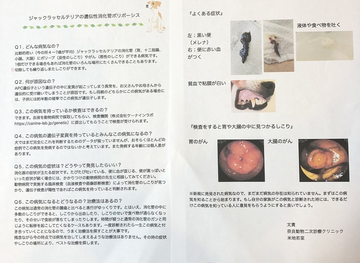 獣医より、下記「ジャックラッセルテリアの遺伝性消化管ポリポーシス」の資料を基に以下のような説明がありました。