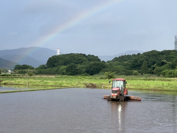 6月11日にチェーン除草と代かきの前の荒がきをして、6月12日代かきをしました。念には念で代かきをする前の午前中にチェーン除草を丹念にかけました。代かき作業中に虹が現れて、美しい背景となりました。代かきと荒がきは、遠藤さんに細かく細かく丁寧にお願いしました。