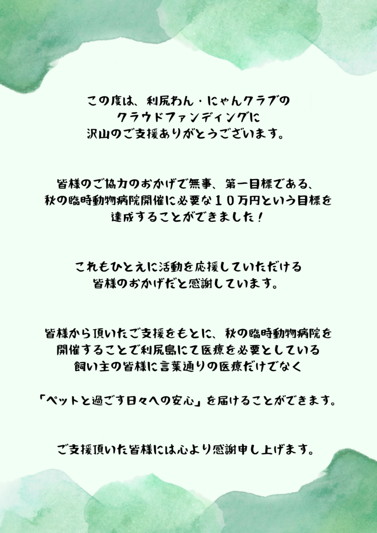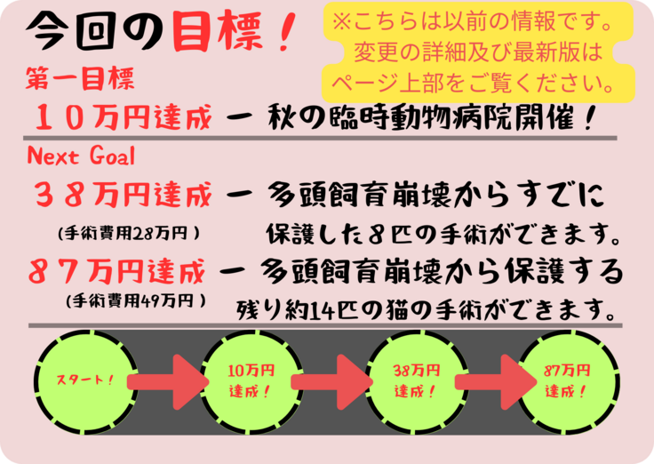 - 本文でも書いた通り、今年の活動資金を大幅に超える出費予定があります。 まずは確実に秋の臨時動物病院を開催するために、ゴールを最低限の開催費用とさせていただきました。 本来必要な50万円という目標は、多頭飼育崩壊にて保護した猫の医療費として必要な経費ですが、こちらに関してはどれほどの時間がかかるかわかりませんが、資金がたまり次第一匹ずつ自己負担にて対処していきます。