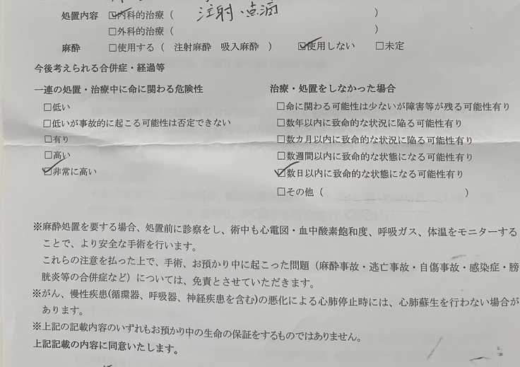 考えたくはありませんが、万が一治療期間中に亡くなってしまった場合、返金は致しかねます。いただいた資金を今までの治療費・検査費用・お薬代にあてさせていただきます。