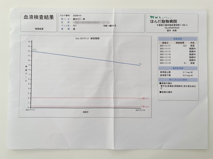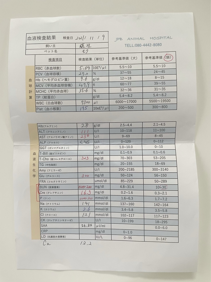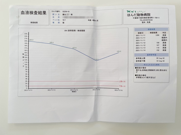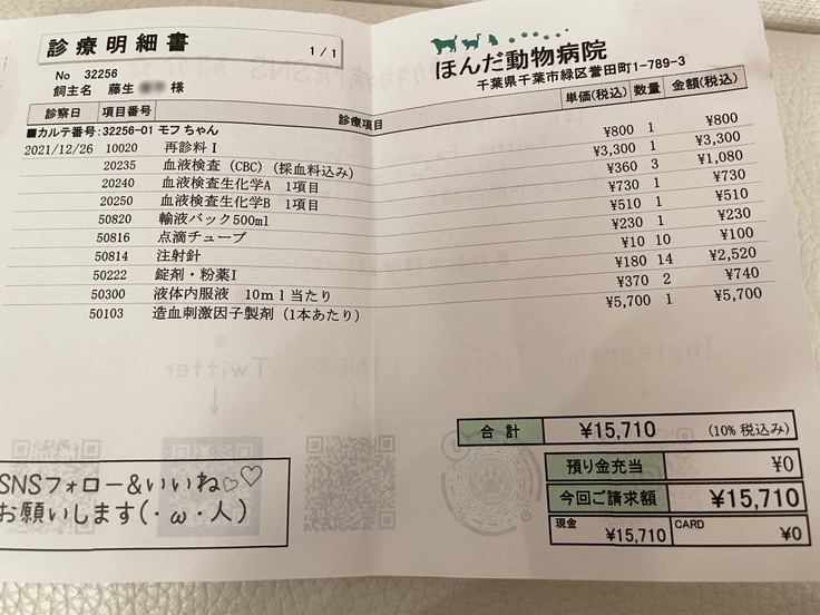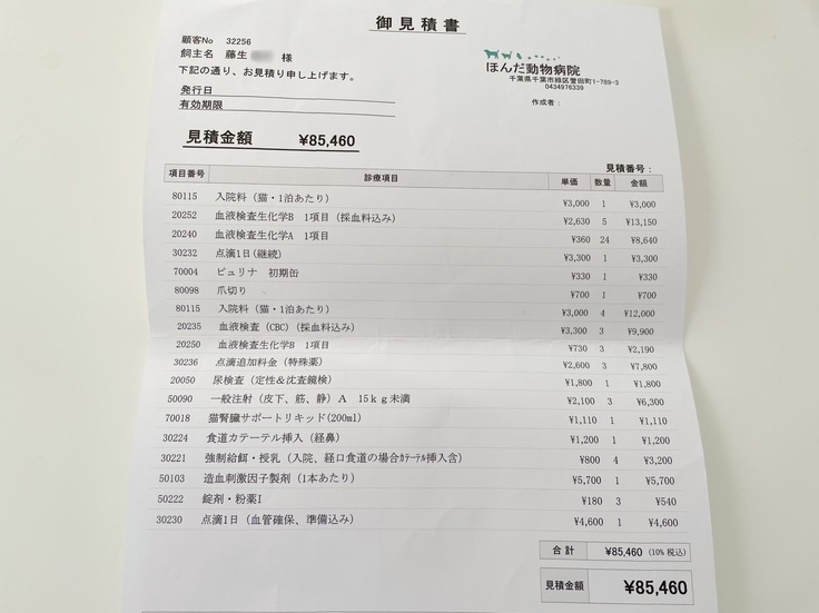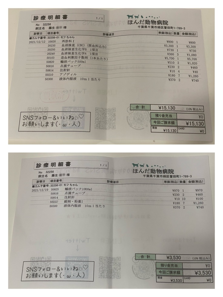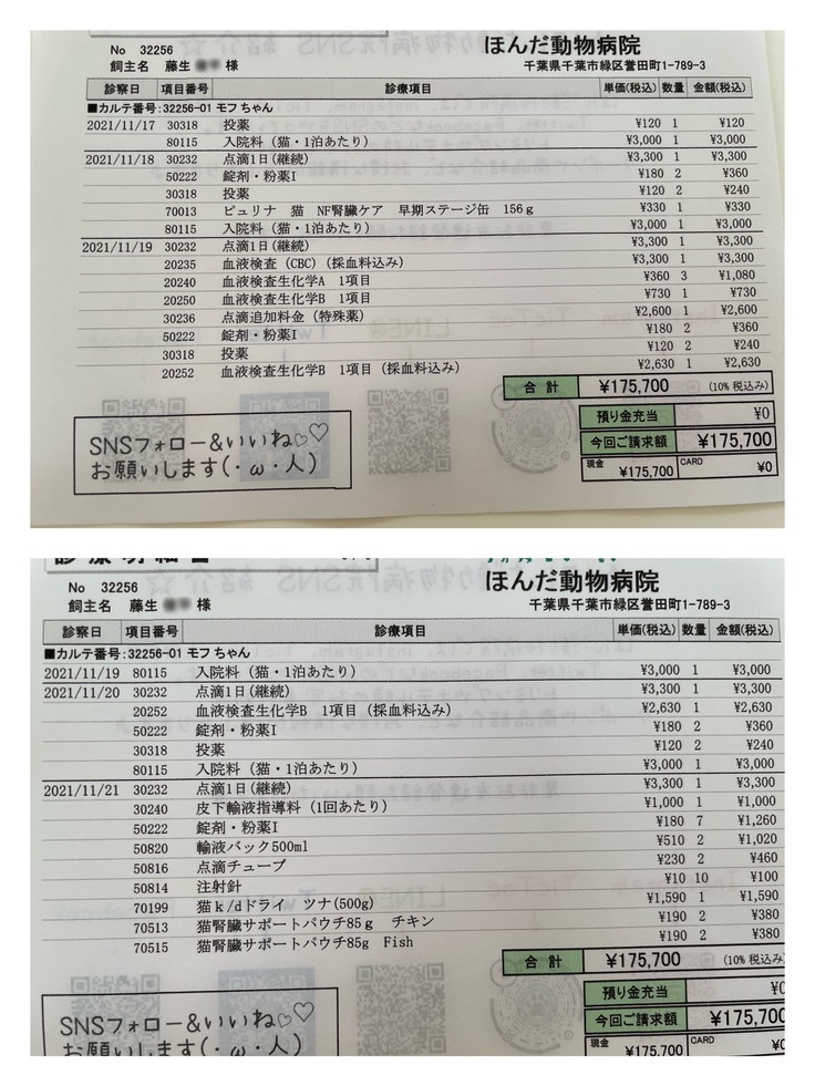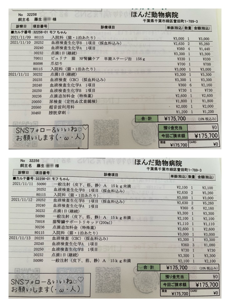 まだ通院治療等(レントゲン検査、超音波検査、血液検査、造血剤、投薬(3種類)、シリンジ、療法食(ウェット、パウチ、カリカリ)、皮下点滴)