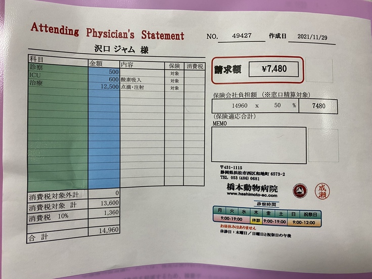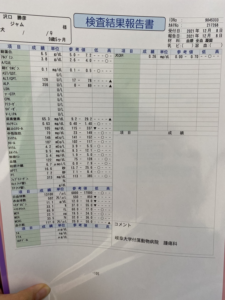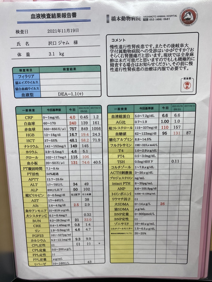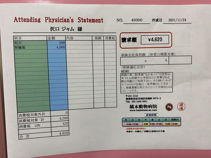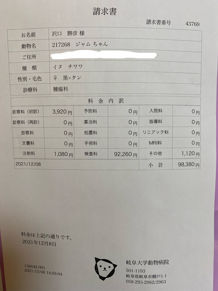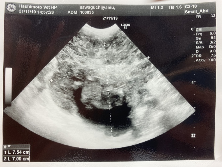 ジャムは先月、病院で腎臓がんの疑いがあると言われました。手術ができるかなどの検査をしに岐阜大の動物病院まで行きました。そこで、腫瘍が大きすぎるしいろんな血管や臓器を巻き込んでしまっているため、手術は難しい。手術したとしても余命はほとんど変わらないと言われました。できる治療は放射線治療、抗がん剤、今までやっていた炎症を抑える薬を飲む。治療はとても限られてしまうそうです。放射線治療は苦しむイメージがあるしやるか迷ったのですが、いろいろ検索していると1年も生きるのは難しいと言われていた子が3年生きたというのがあったり、岐阜大の医療機器は最新のものだったりして、やってみようと思いました。放射線治療は約30万かかると言われました。この前の検査でも10万かかりました。腫瘍に圧迫されて食欲がなくなったりするのを緩和するために放射線をがんに当てて小さくするということを行います。金銭面で苦しくなっているので、みなさんの力を借りたいと思いました。