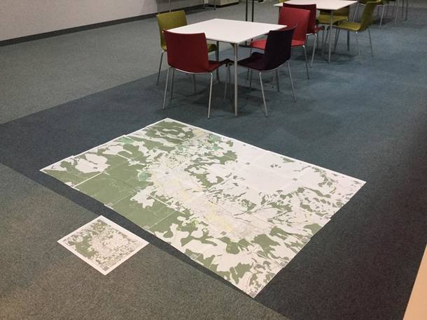 現場ではこういう大きな紙地図に直接書き込んだりポストイットを貼ったり、そういう場面が多くでてくると考えています。
