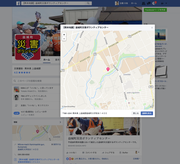 ですので、例えば災害ボランティアセンターや多くのNPOなどが支援にFacebookを用いていると、結果としてそこに表示される多くの地図が、我々のクライシスマッピングの結果が反映されたオープンストリートマップが形を変えて登場します。