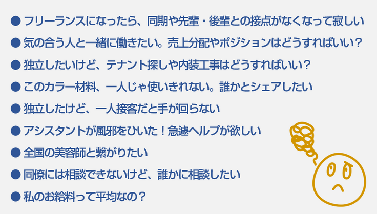 美容業は、若くして独立開店する人が多いだけに、経営への不安が伴いやすく、悩んでいる人はたくさんいます。美容室の狭い人間関係に困っている人、独立後に孤独を感じている人も多数います。