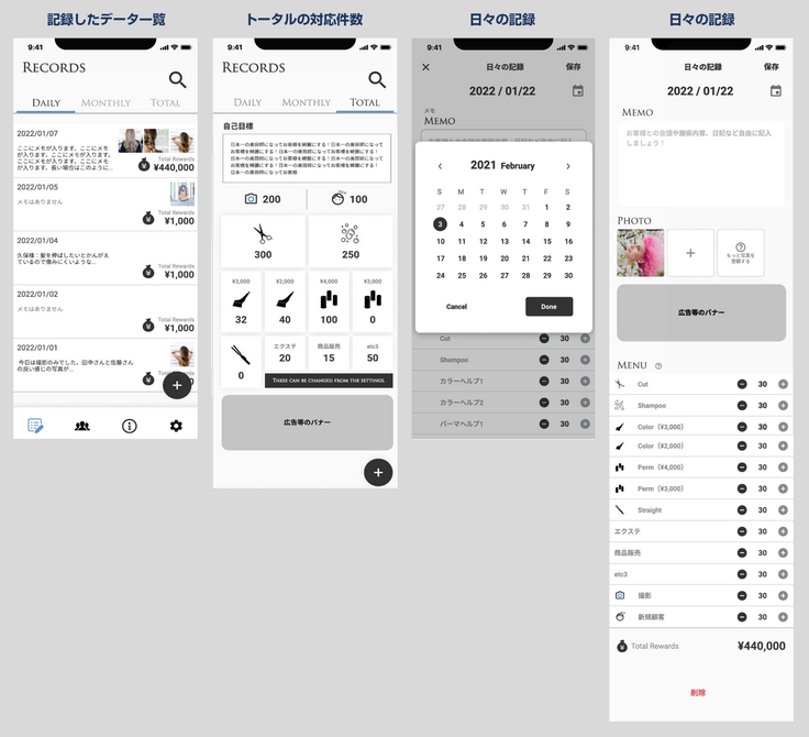 接客時のメモと、業務対応件数を記録できます。タップするだけの簡単操作で、検索もラクラク!