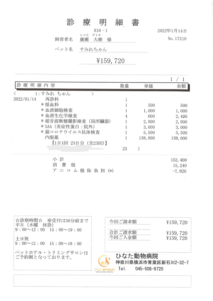 □1月14日の診療にて、治療薬を投薬終了日1月23日(日)までの分をいただき、血液検査を行ってまいりました。
