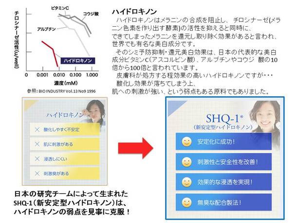 日本の医療現場でドクターの要望によって、産官学連携プロジェクトで開発された美白原料。業務用として開発された原料なので一般の方にはあまり知られていないですが、医療機関を中心にしみ・あざなど、色素沈着への治療に処方されています。SHQ-1は「低刺激」「酸化しにくい」のが特徴。いわば、メイド・イン・ジャパンの「お肌に優しいハイドロキノン」。医療機関専用の美白原料です。