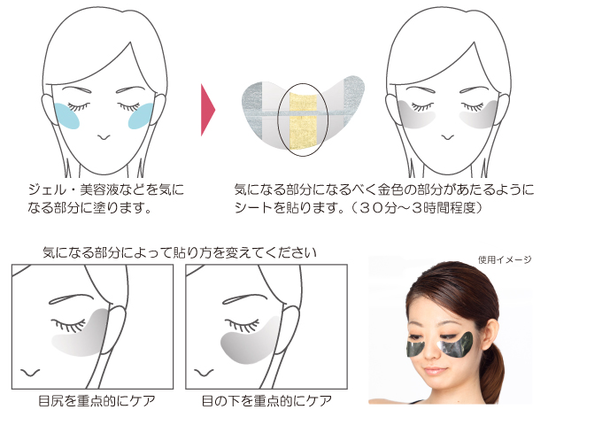 3.気になる部分になるべく金色の部分が当たるように、シートを貼ります。(30分~3時間程度)※気になる部分によって貼り方を変えて下さい(目じり、目の下、ほうれい線など、色々な箇所へ使用できます)
