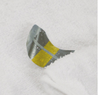 1.(使用前)イオン導入シートのお肌にふれる面を確認します。金の部分と酸化亜鉛の部分が見える面が、お肌にふれる面です。