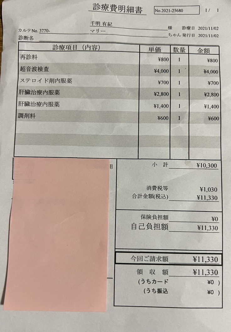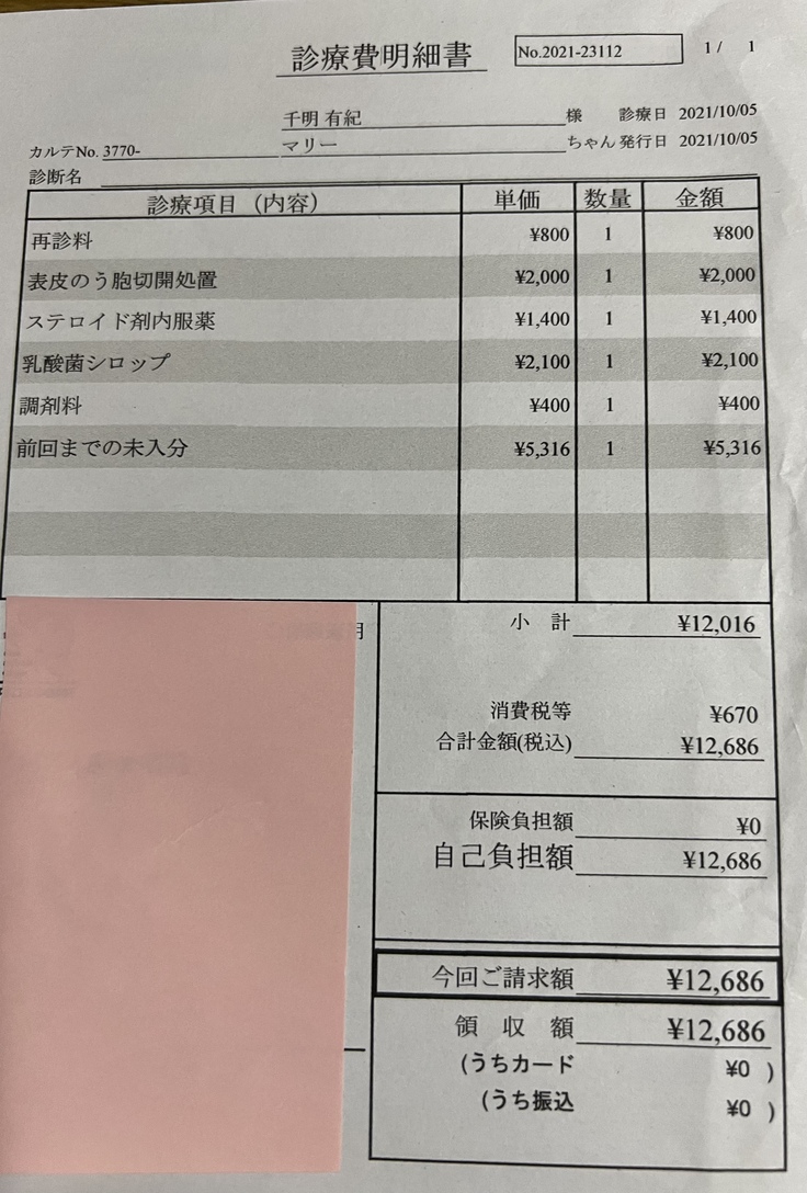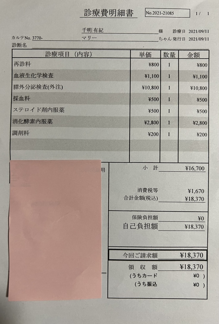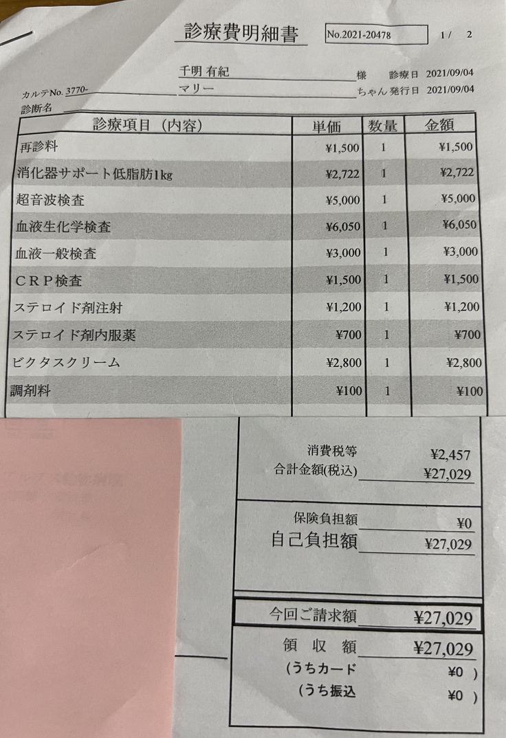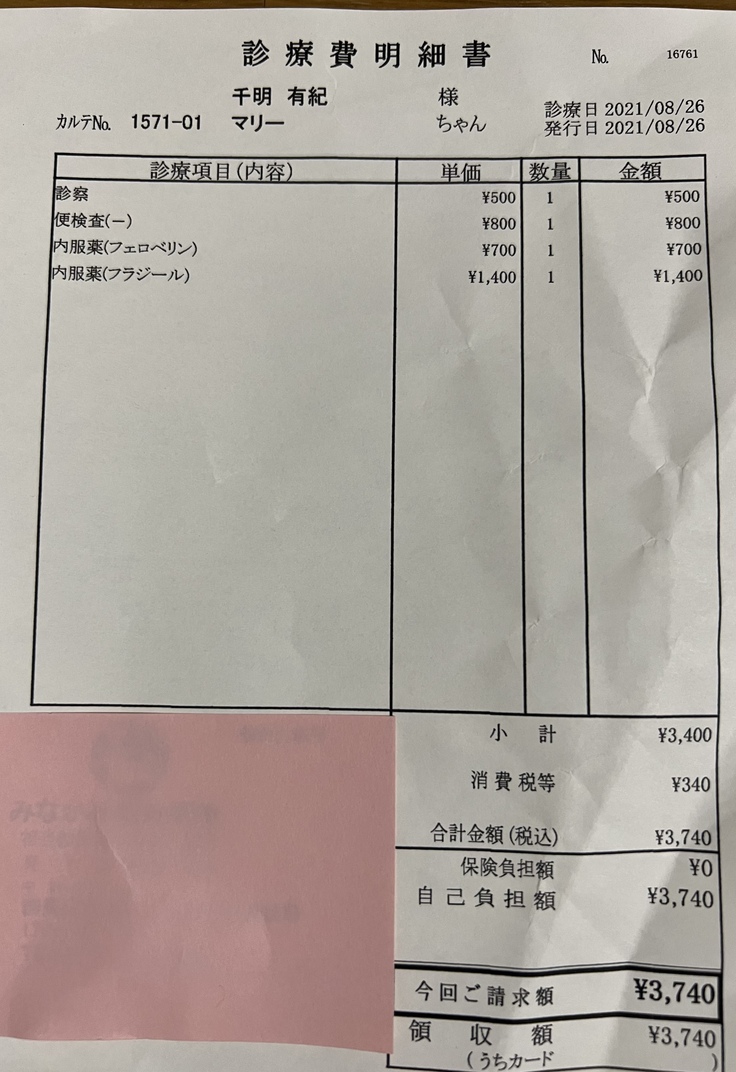 お腹の調子が悪くなってからかかった治療費の領収書です。
