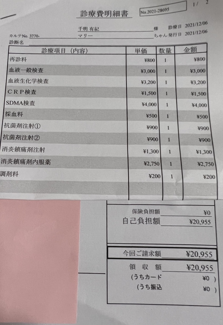 抗菌剤の注射を2本、消炎剤の注射を1本打って、お薬をいただいて帰りました。2万円かかってしまいました。