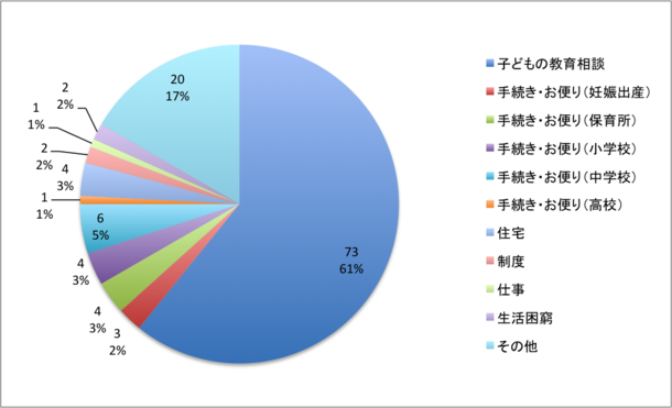 2016年2月〜5月の期間で120件。私たちが訪問して聞き取った相談や電話での相談などを含みます。また、小さい相談から大きな相談まで色々な内容のものがありますが、120件の中で相談件数が一番多いのが「子どもの教育相談」で、73件ありました。