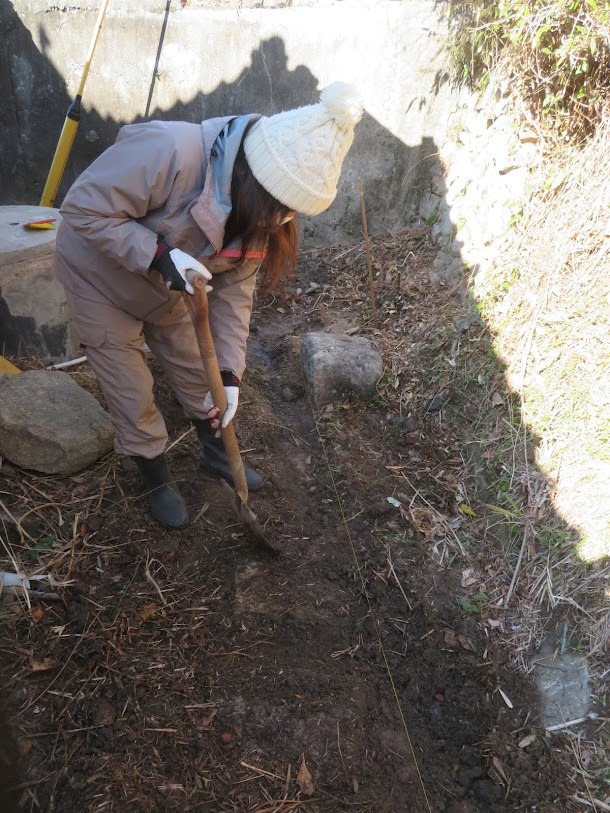 U字溝を埋める溝を、石を覗きながら掘っていきました。