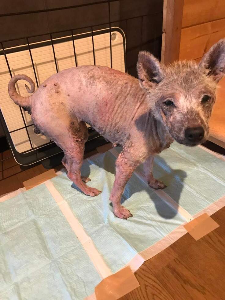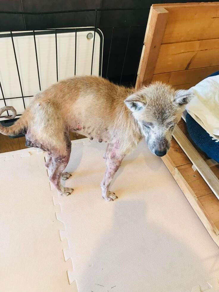 新潟の実家に帰った時に、近所の空き家に置き去りにされてしまった犬がいるという話を聞き、どうにか出来ないかと思い、見に行きました。ドアを開けると、あちこちに糞尿が落ちていて、すごい悪臭がしました。1匹の犬が寄ってきました。想像以上にひどい状態で、全く毛がなく、皮膚もただれていて、匂いもすごくて、撫でてあげることができませんでした。長野までの帰り道、撫でてあげられなかったことがものすごい後悔でした。保健所に通報してしまったら、おそらく殺処分になってしまうと思い、通報もできず、次の週にまた訪ねて行きました。近所の方や、近くの獣医さんを訪ねてみたところ、名前はヒメ(9才)であることが分かりました。2年前までは通院していたようです。爪も伸びきっていて自分に刺さっていました。ご飯だけは時々置きに来ているようでしたが、このまま放置したら凍死してしまうと思い、連れて帰ってきました。
