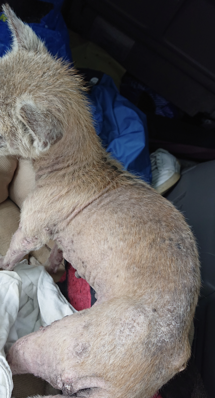 保護した後、近所の動物病院を受診しましたがその獣医さんによると『こんなに酷い皮膚病の犬は見たことがない。皮膚病の成れの果てだ。完治には放置した時間と同じ時間がかかります。根気強く治療を続けましょう』とお医者さんから伝えられました。