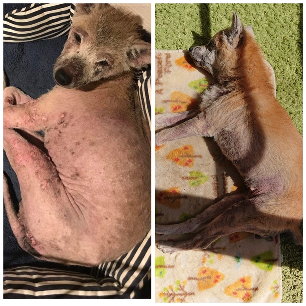 左は保護した10月の写真で、右は5ヶ月たった最近の日向ぼっこしている写真です。まだ足とお腹の毛が薄いですが治療の効果がはっきり分かります。性格も当初は噛みつかれ病院に行き治療したこともあるくらい不安定で、気を許してくれませんでしたが、今ではリラックスしてくれるようになりました。