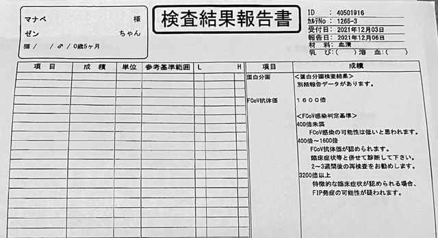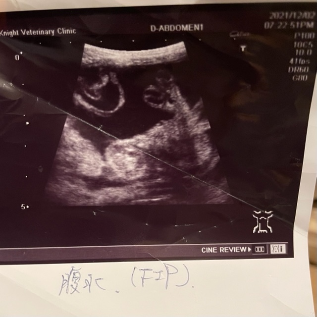 たくさんのFIPの猫ちゃんを診られている獣医さんが「検査結果を見なくても慢性的な下痢、発熱、腹水の症状から診てFIPで間違いない」と宣言される。