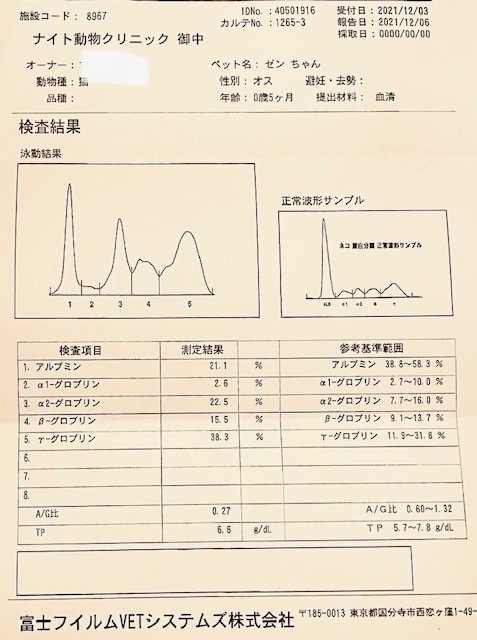 12/2 腹水が溜まっておりFIP(猫伝染性腹膜炎)の疑いがあると言われ血液検査をする