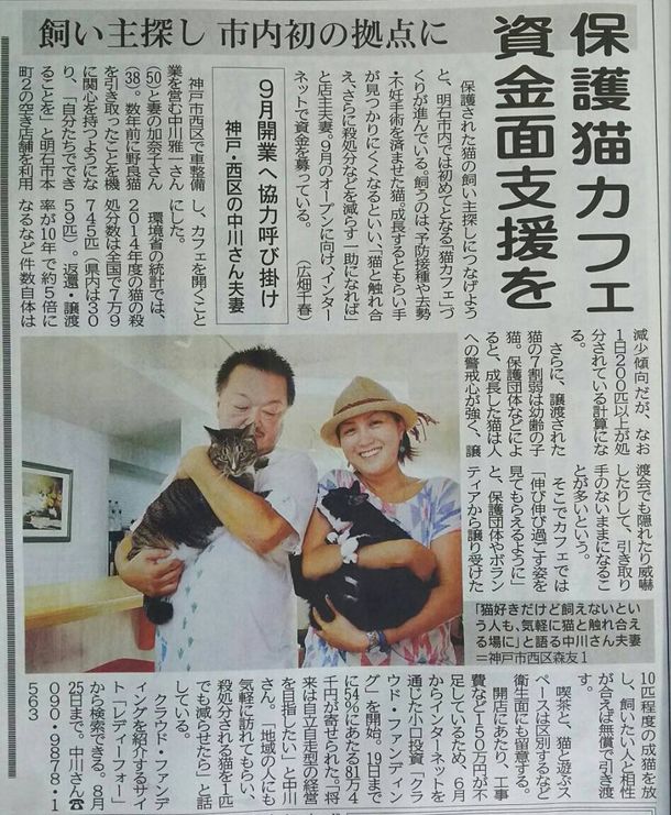 『保護猫カフェ』開業にかける私達の想い、そしてこのクラウドファンディングのことも記事にして頂き、早速新聞を見られた方からご支援を頂きました!