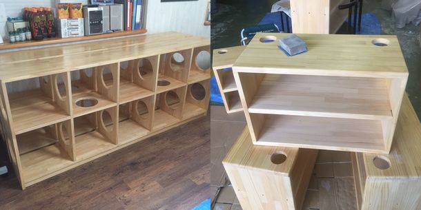 そして、猫ちゃんの遊び棚とカップホルダー付きテーブルのニス塗りもあと少しです!