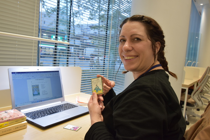カーロイは大学で日本語・日本文化を専攻していましたが、文学に惹かれたのは授業で昔話を翻訳したのがきっかけでした。その後、短期留学中に昔話のようなものを探していることを職員さんに伝えると、今昔物語集をすすめられました。在学中には卒業論文・修士論文を説話の翻訳を中心に書きました。和歌と出会ったのは大学院の一年目の時でした。先生が古典文法を教えるため『百人一首』の歌を使い、かるたのことについても話してくださいました。「100首の歌を覚えないとできないゲームなんて、面白すぎる!」と思い、大学でかるた会を作って、同級生と一緒に書いていたブログに趣味程度で百人一首の歌の翻訳も投稿していました。自分でそれぞれの歌を探っていくのがとても楽しく、大学の授業で百人一首について教えている時は、学生さんにその楽しさを伝えることを一番大事にしています。説話であろうと和歌であろうと、ハンガリー人であろうと日本人であろうと、作品に潜んでいる面白さを皆さんに知って頂きたいです。