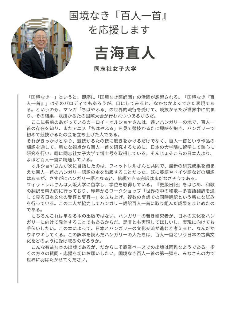 この度は『百人一首』のハンガリー語訳注をハンガリーで出版したく、このプロジェクトをはじめました。翻訳作業がすでに終わり、出版社からもGOサインが出ています。ただし、費用は私たちの負担であり、そこで皆さまの力を貸して頂きたいです。以下にプロジェクト内容をまとめました。是非日本文学の海外普及にご協力ください。