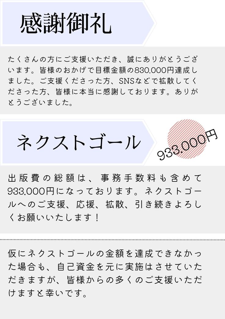 出版に必要な資金の詳細は以下の通りです。 明細(広告・営業費等は除く) *印刷費 512 287円(用紙費を含む) *製本費 54 887円 *用紙代 「印刷費」に含まれている *編集・校閲費 109 775円 ・前印刷準備の費用:146 367円