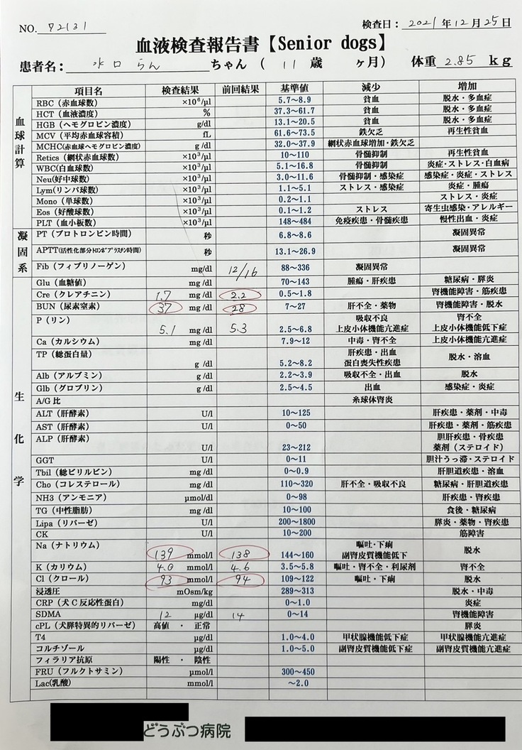 BU N(尿素窒素)の項目は前回よりも数値が多いですが、こちらはおしっこが溜まっている状態なのでおしっこをしたら問題ないとのことです。