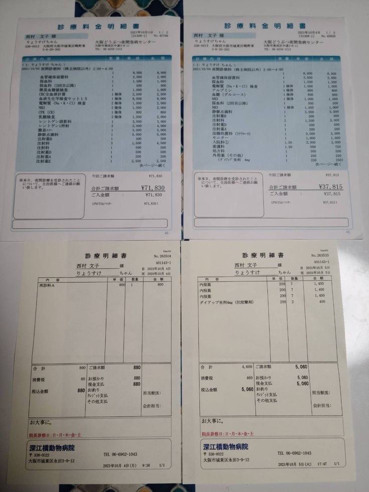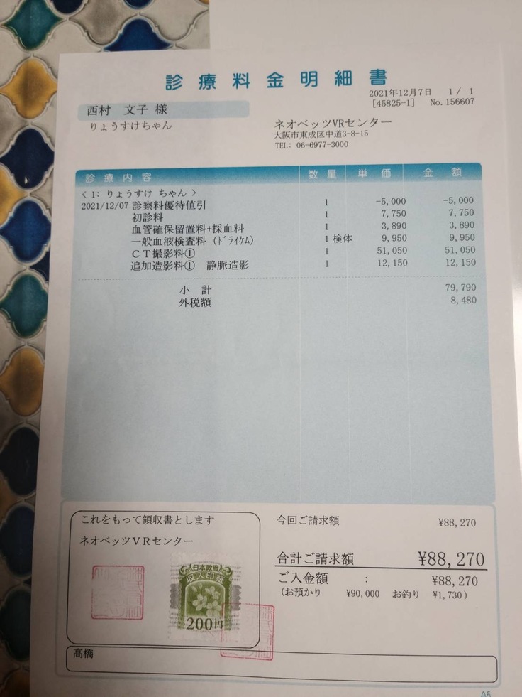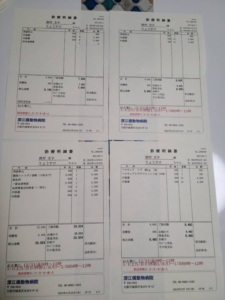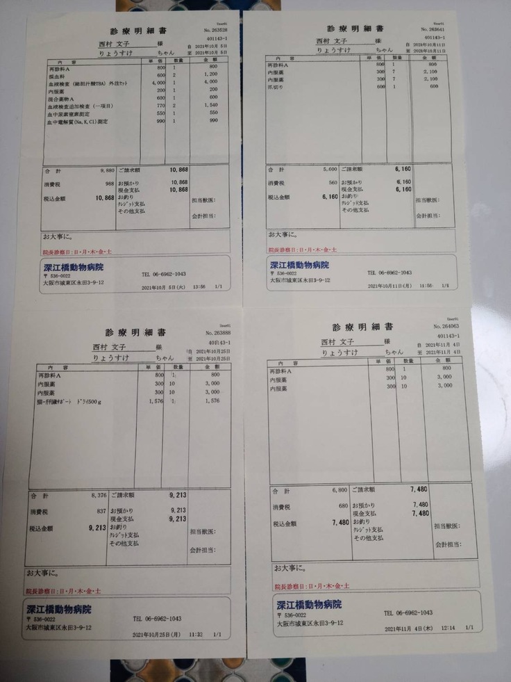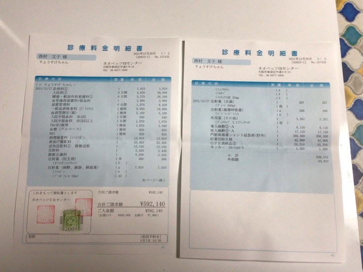 飼い猫のりょうすけの門脈シャントの手術及び入院費用及び治療費 12/7CT撮影 88270円 12/231回目の手術及び入院費用 約60万円 2回目の手術が体調にもよりますが2ヵ月後を予定 約60万円と病院より提示