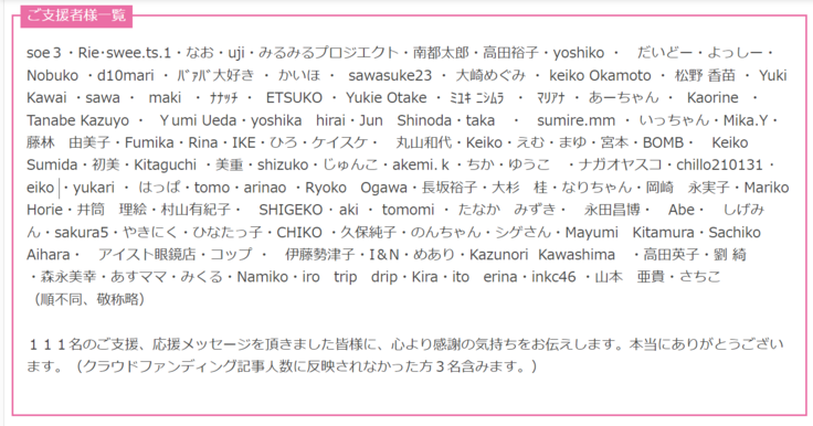 そして、たった一人の私の声に賛同して下さった111名のご支援者様