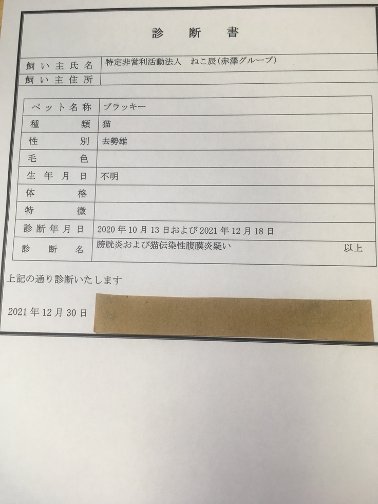 血液検査等をしたところ、数値がFIP発症の数値に極めて近いと、獣医師より指摘されました。発症を未然に防ぐためにも継続的な治療と適切な療養食が必要になります。