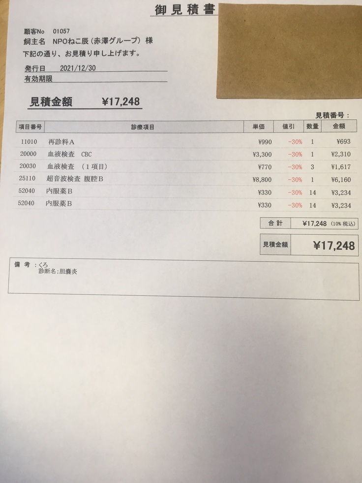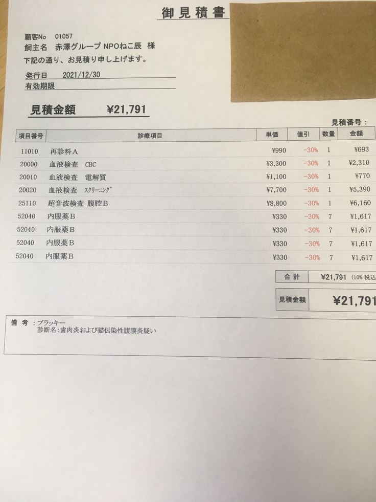 以上、現在治療中の猫たち、計12匹の当面3ヶ月の治療費等として合計520,895円の費用がかかると見込まれます。治療は3ヶ月間で完了するものばかりではありませんが、まずは集中的に期間を3ヶ月間(2022年1月20日~4月20日)と設定し、十分な検査や治療を施したいと考えております。