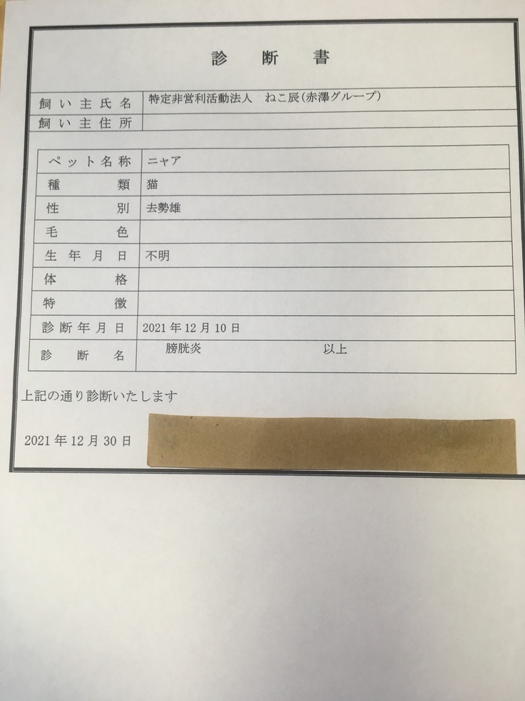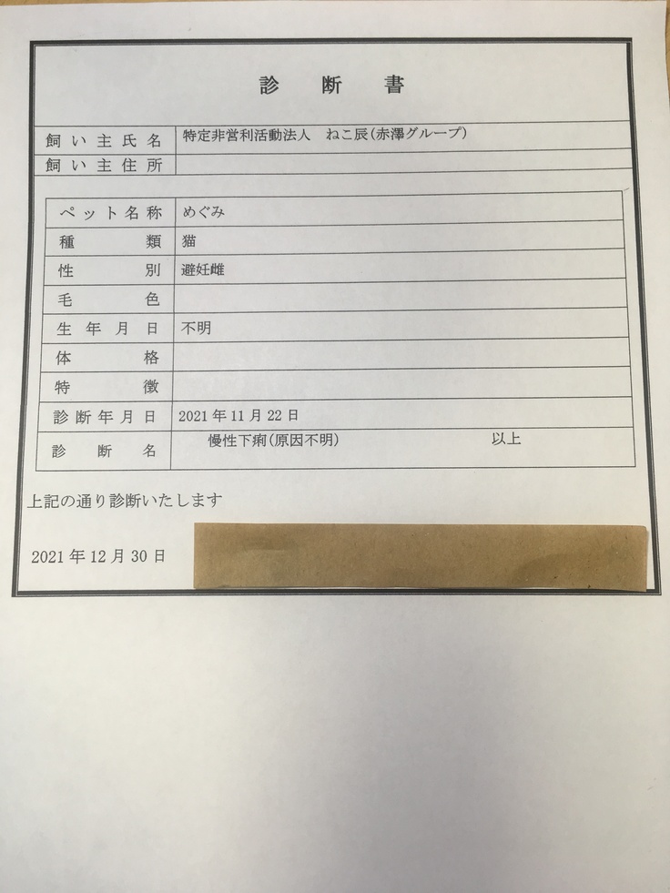原因不明の下痢をこじらせています。外での投薬治療が困難なため、室内に保護してもらっています。継続的な治療が必要となります。