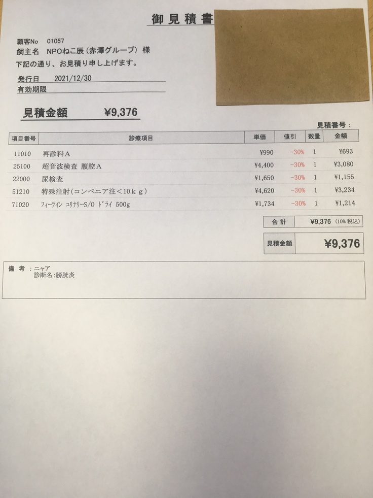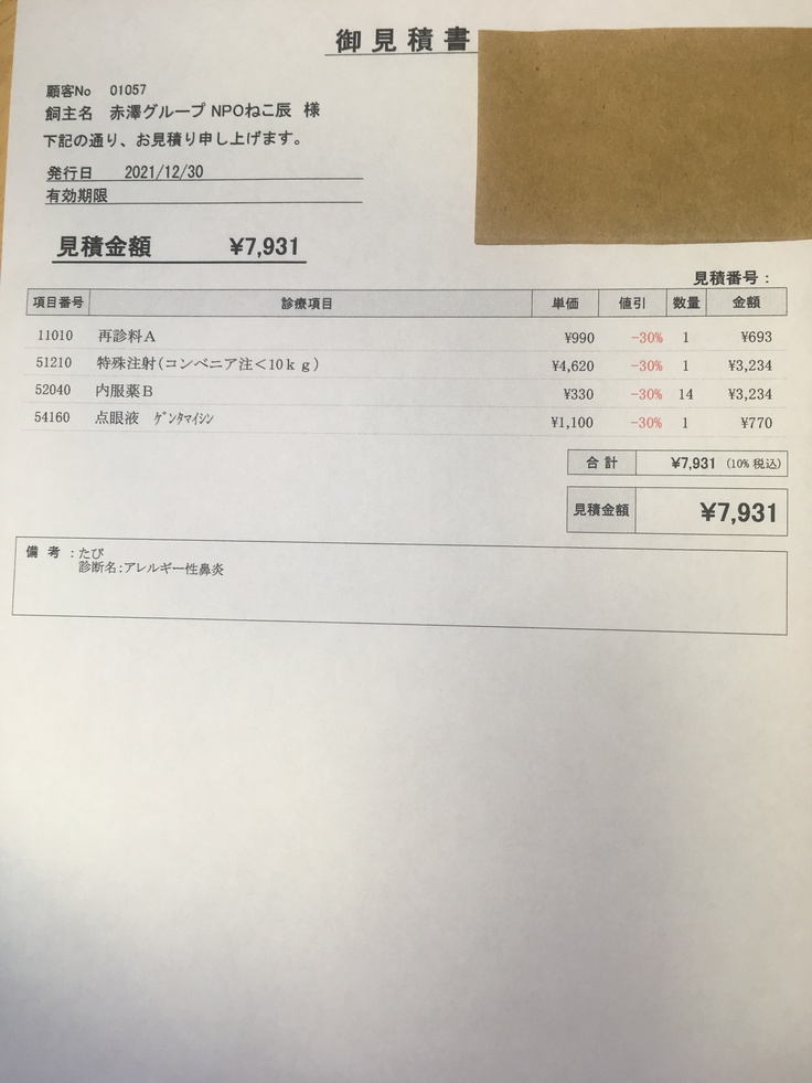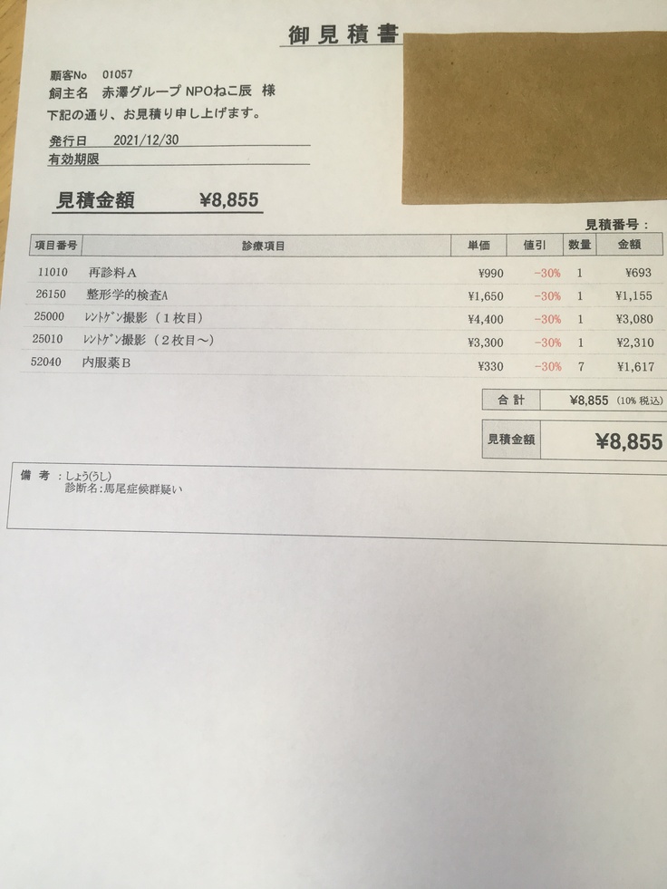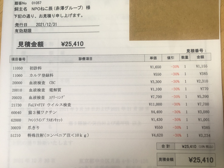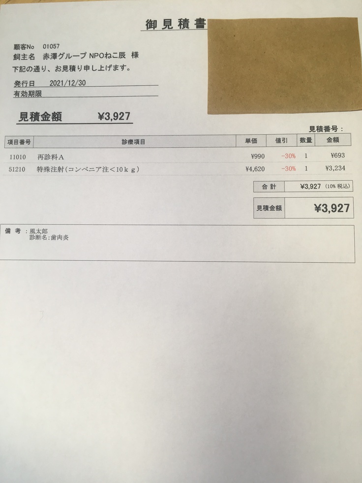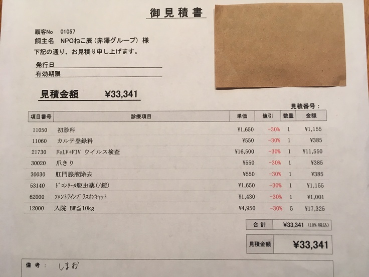室内保護に際し、体調チェックやノミダニ駆除、血液検査等が必要となります。33,341円となります。