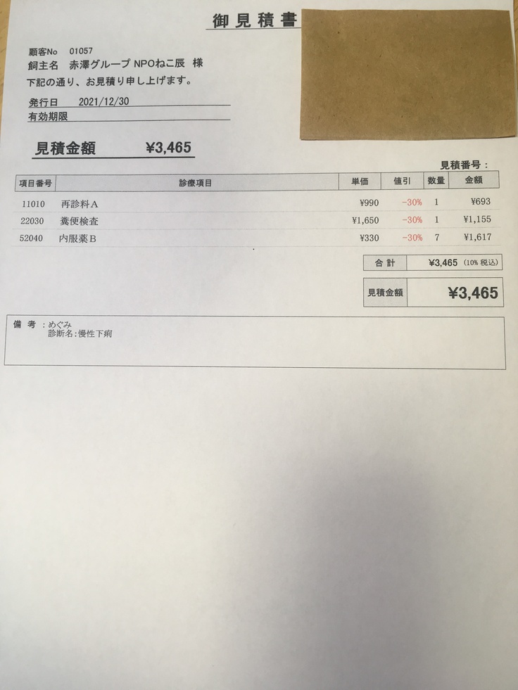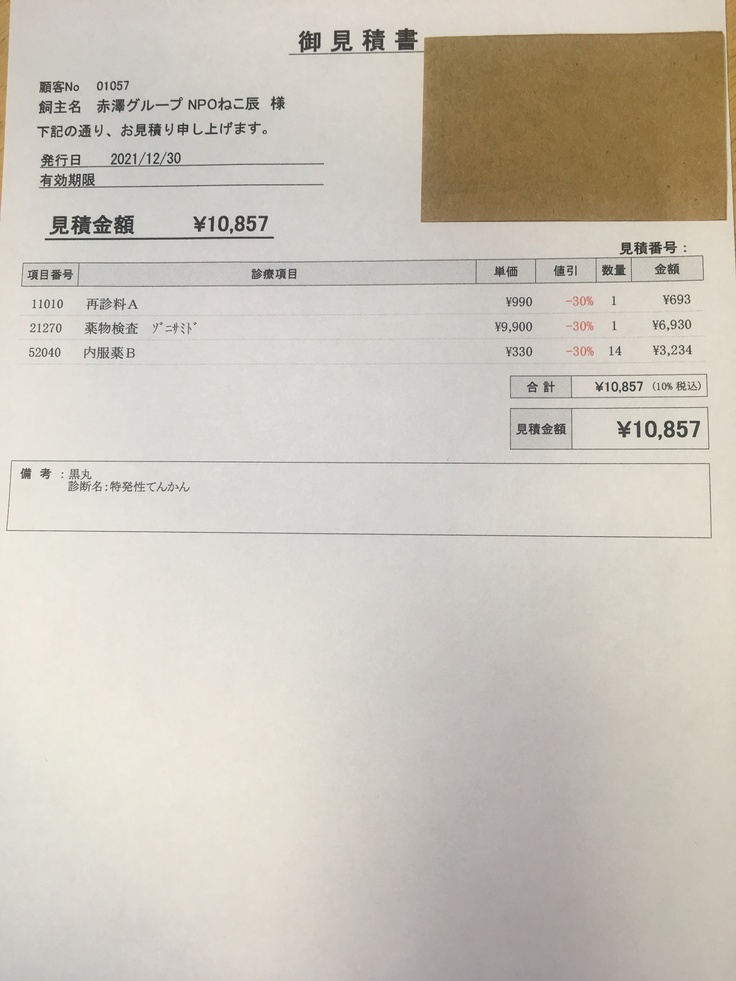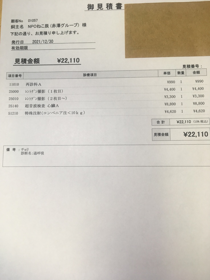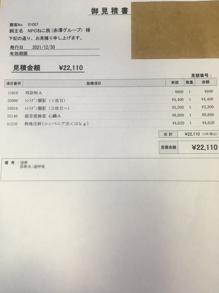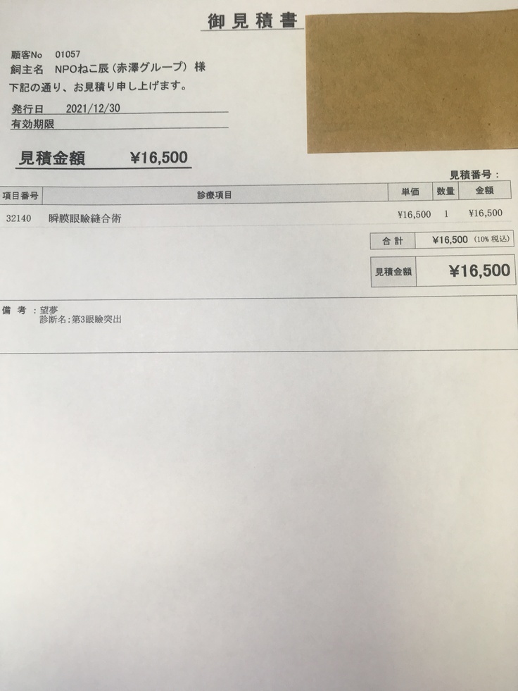 室内保護に際し、体調チェックやノミダニ駆除、血液検査等が必要となります。33,341円となります。