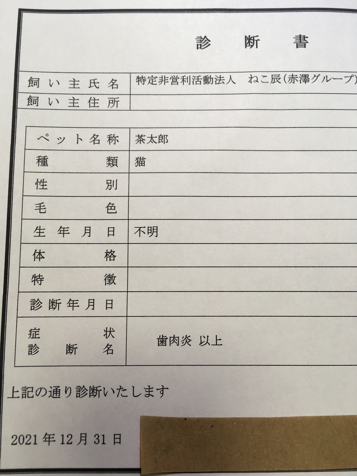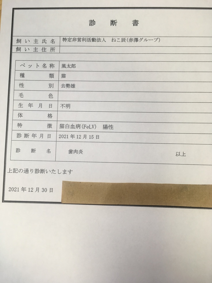 風太郎と同居していた子です。風太郎の白血病キャリアが判明したため、この子も検査が必要です。風太郎以上に口臭がするため、さらに酷い歯肉炎に罹っていると思われます。風太郎と同じく早急なと治療が必要です。