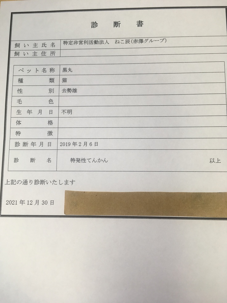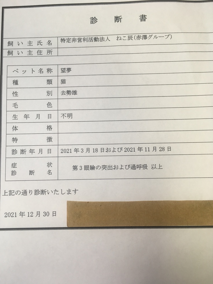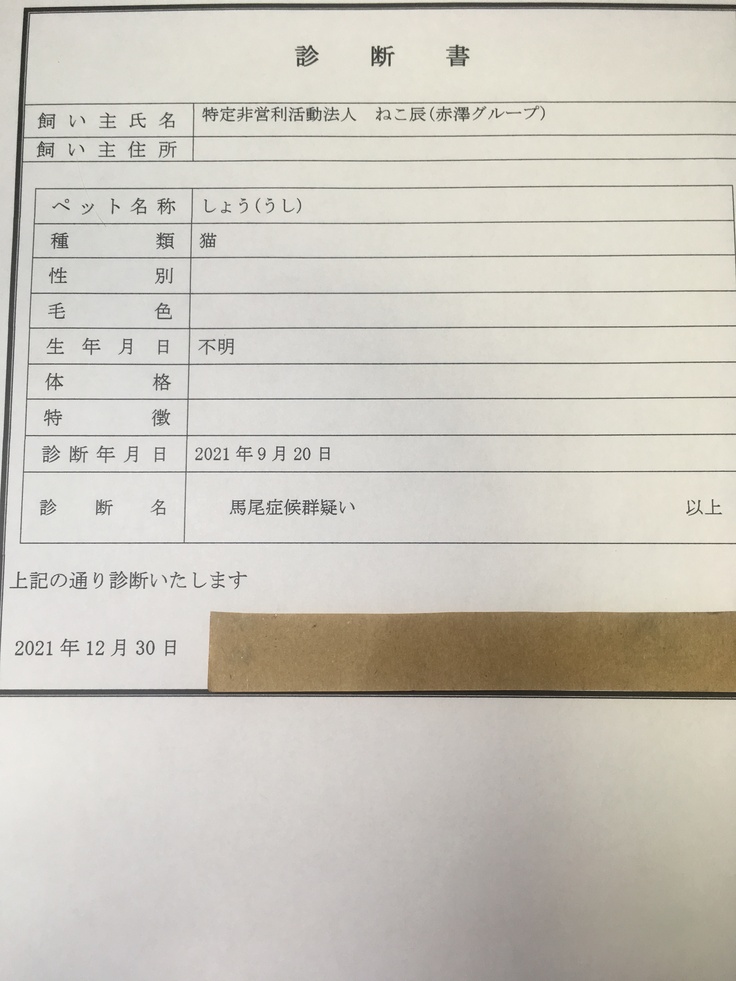 しまおはエイズキャリア保有であり、さらなる検査や適正な栄養管理など、慎重な健康管理が必要となります。