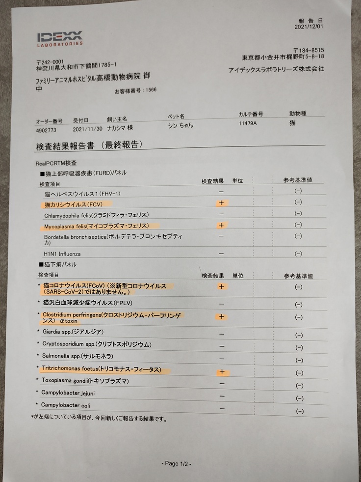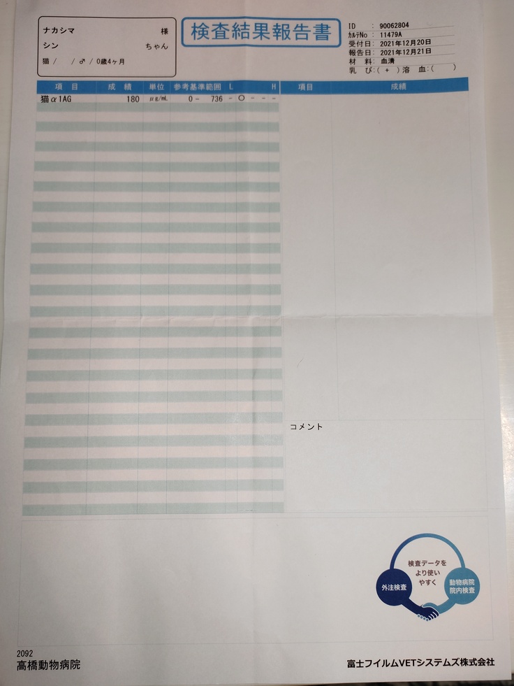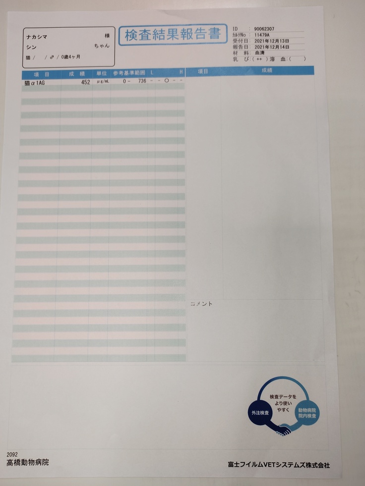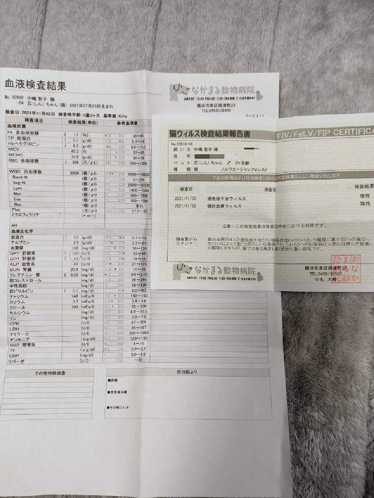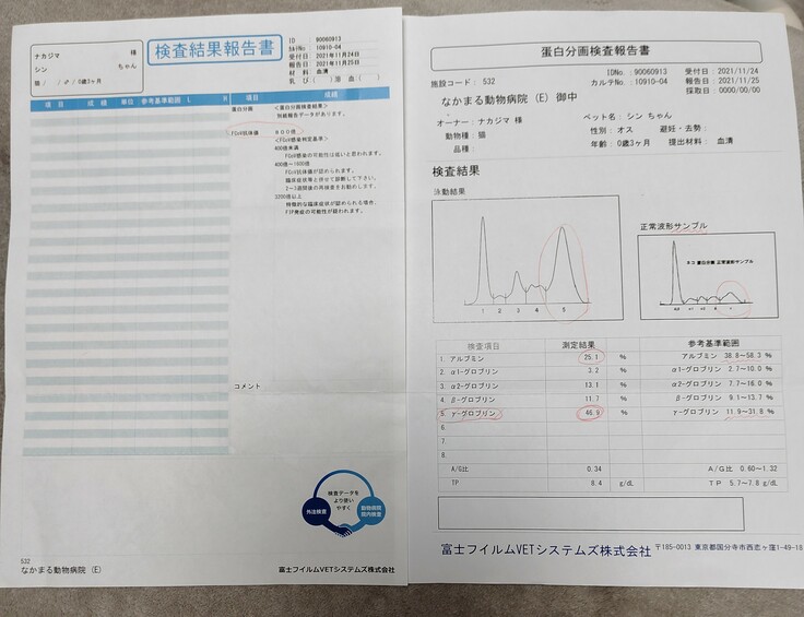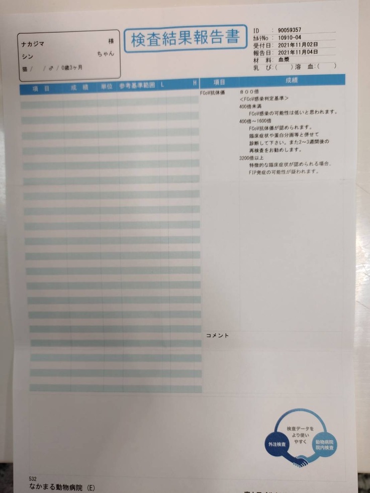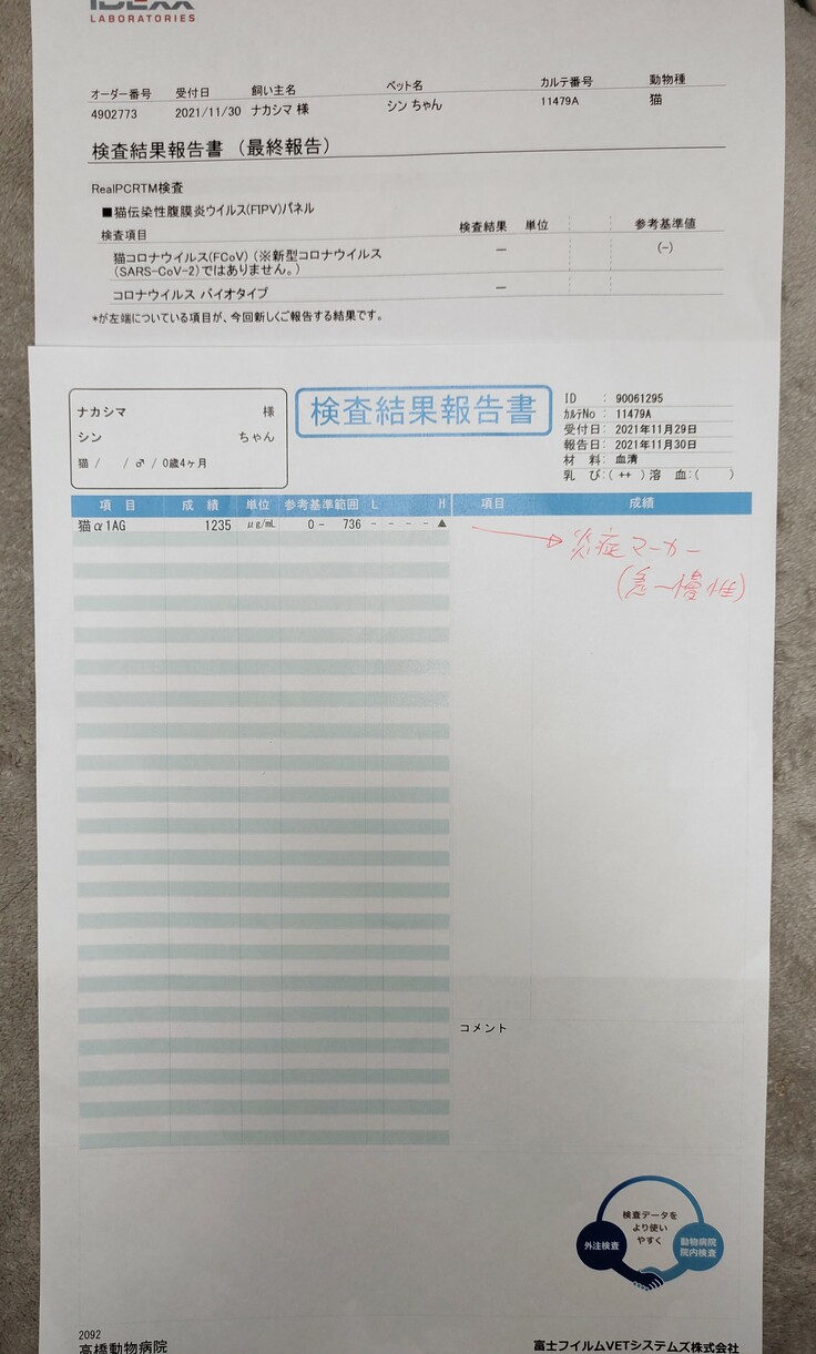 FIPの治療に必要な検査及び新薬の投薬を完了し、芯のFIP寛解を目指します。
