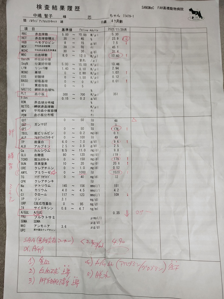 であり、FIPの場合300以下が理想で、180とかなり数値が下がっていました。