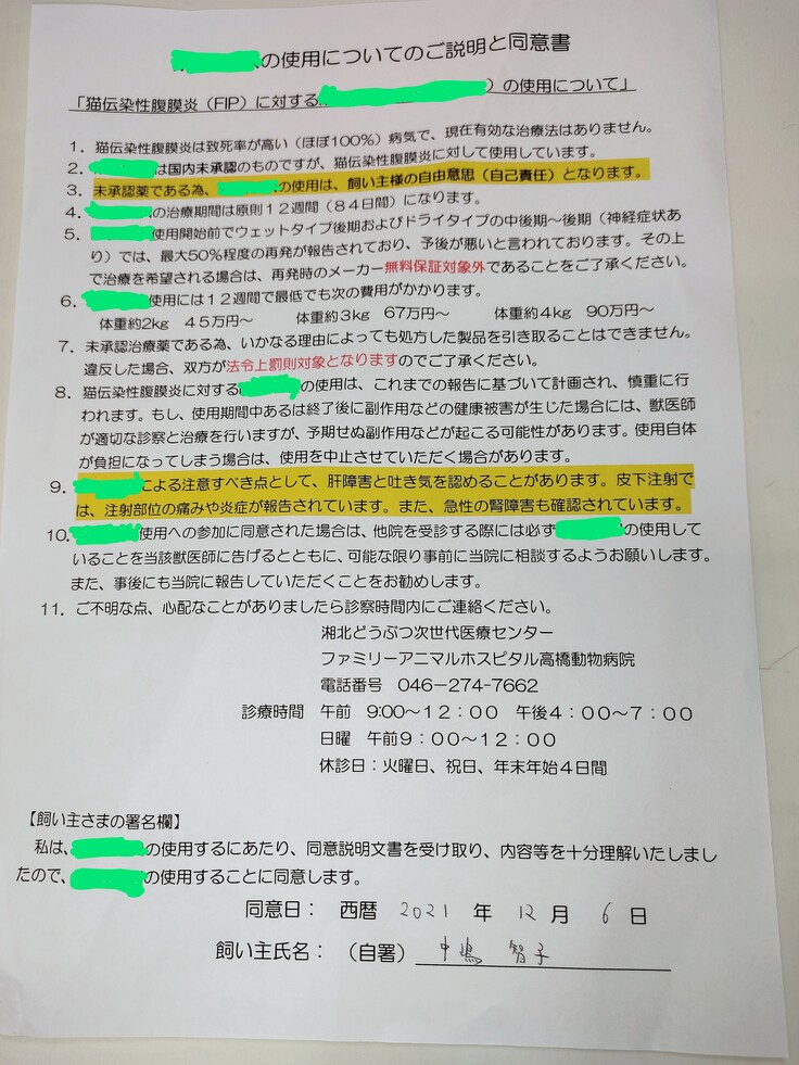 日本では未承認ながらに結果を出している新薬がある事が分かり、県内にもその薬で多くの猫を救ってきたと実績のある病院にたどり着きました。