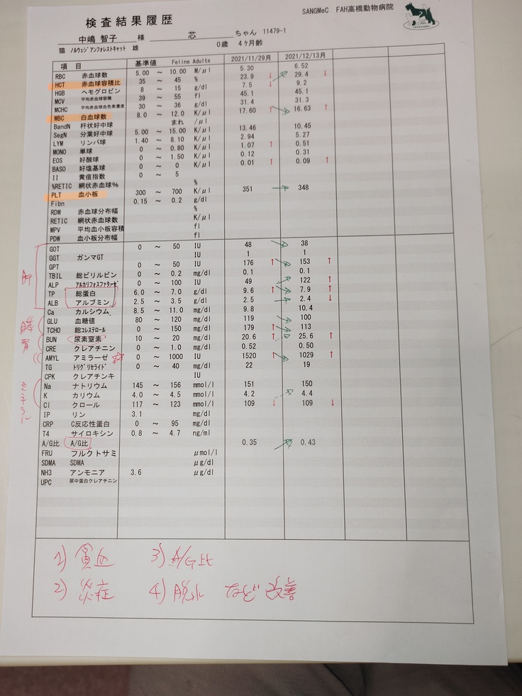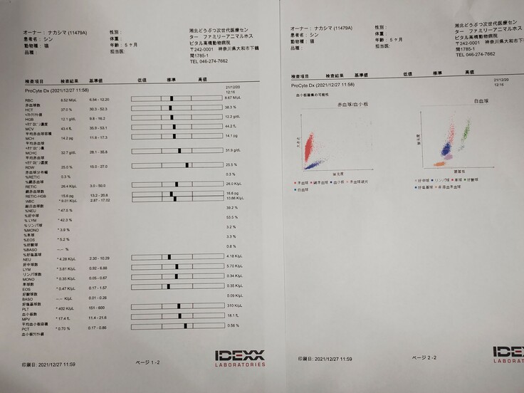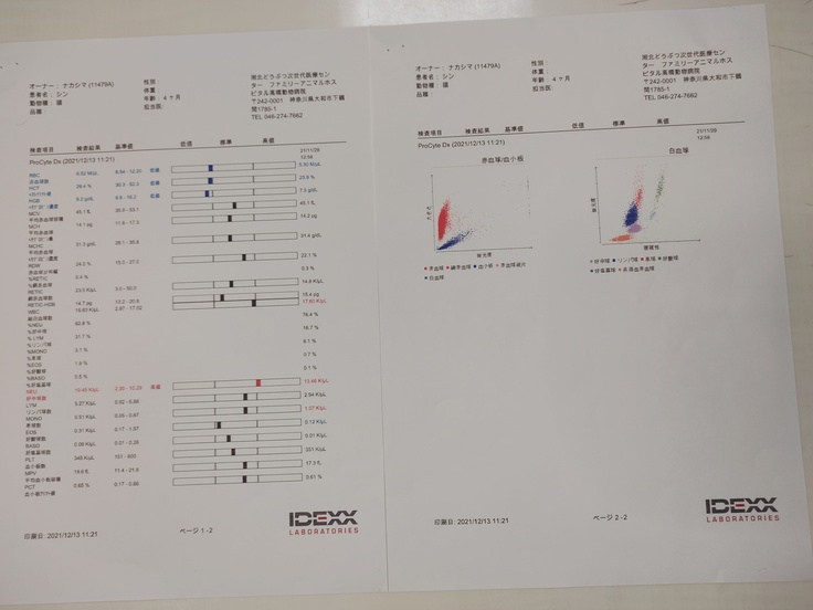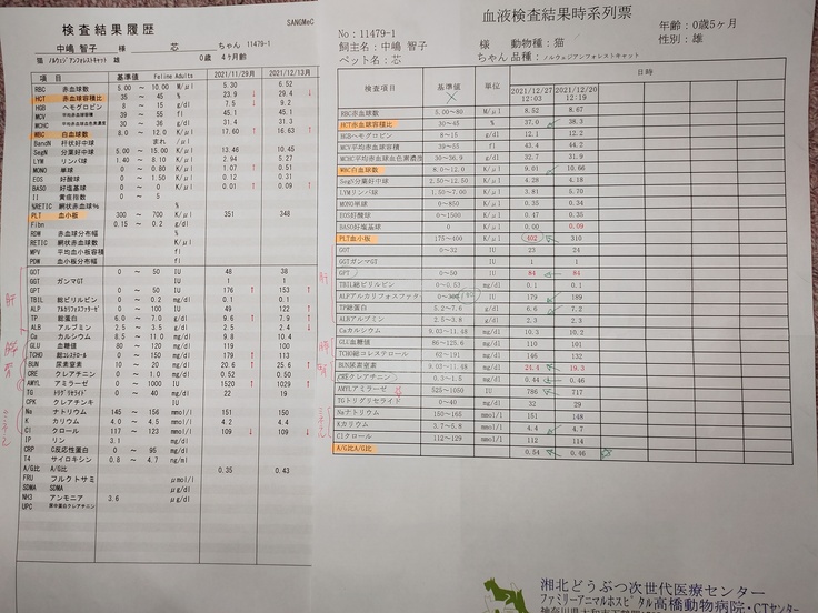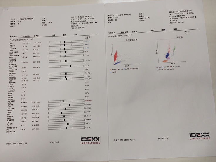 12月13日と、12月20日とを比較すると、貧血と、白血球の値が正常になり、全体的にも炎症や様々な数値が改善されてきているとの事でした。