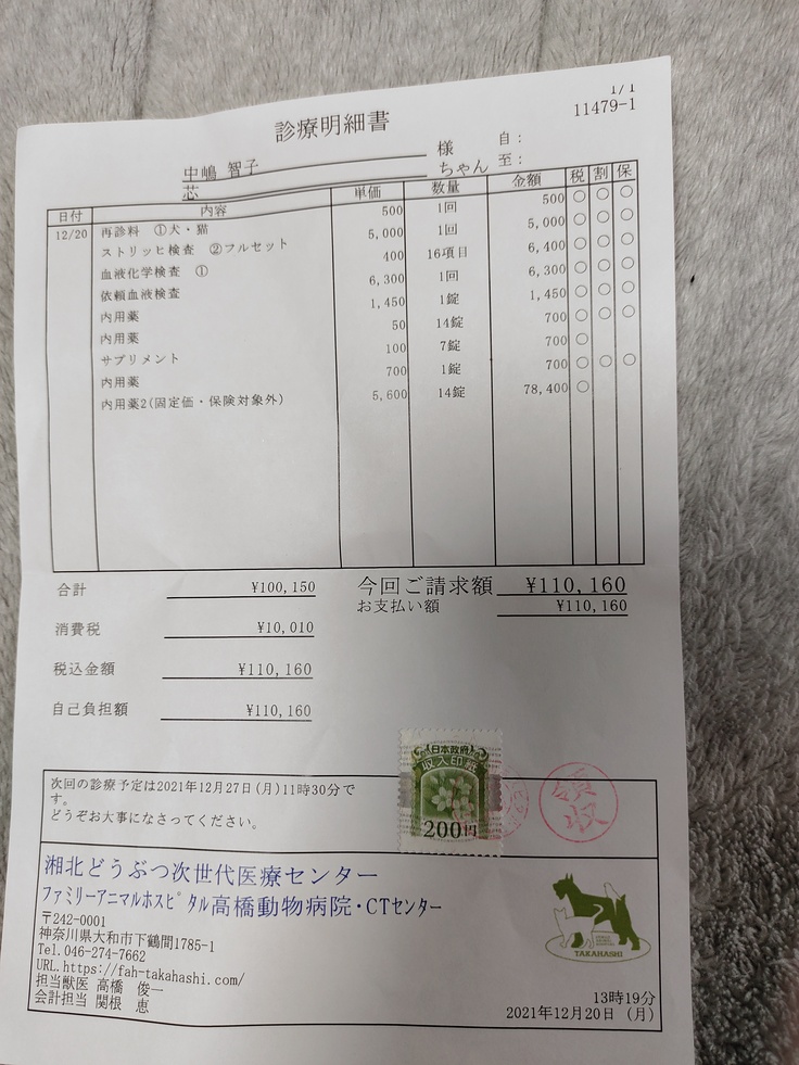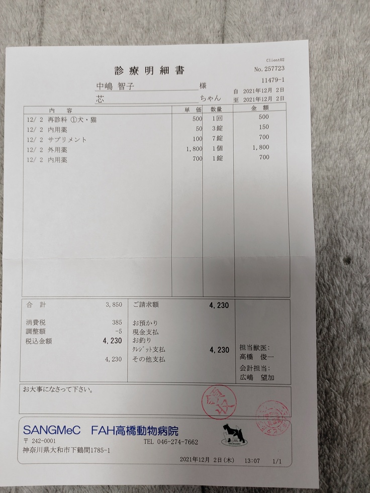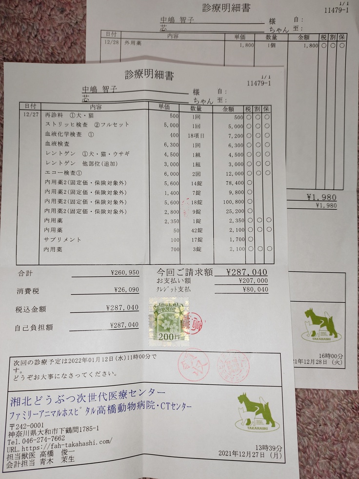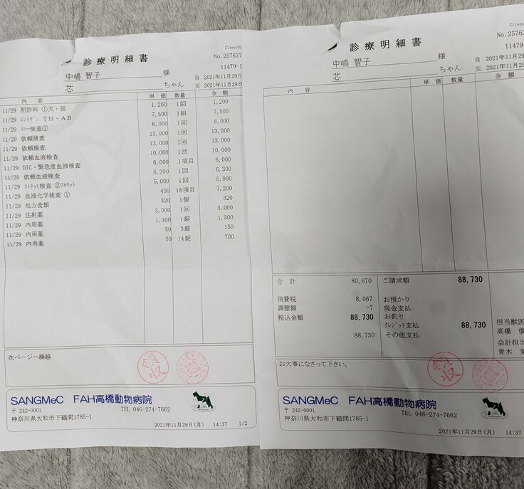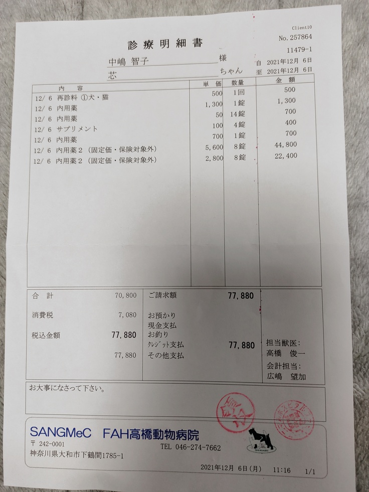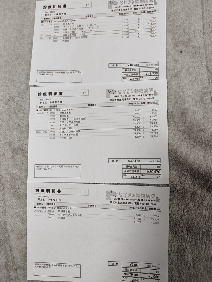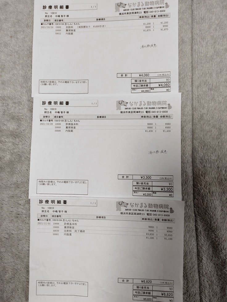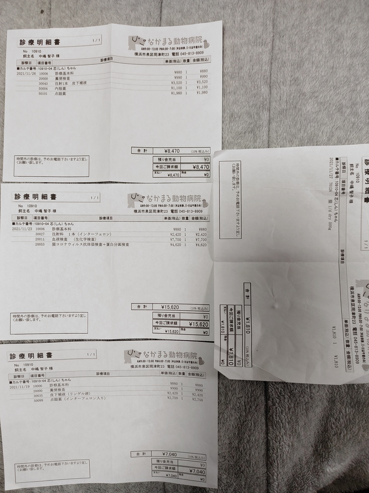 初めて病院に連れて行った令和3年10月2日~12月29日現在に至るまでにかかった