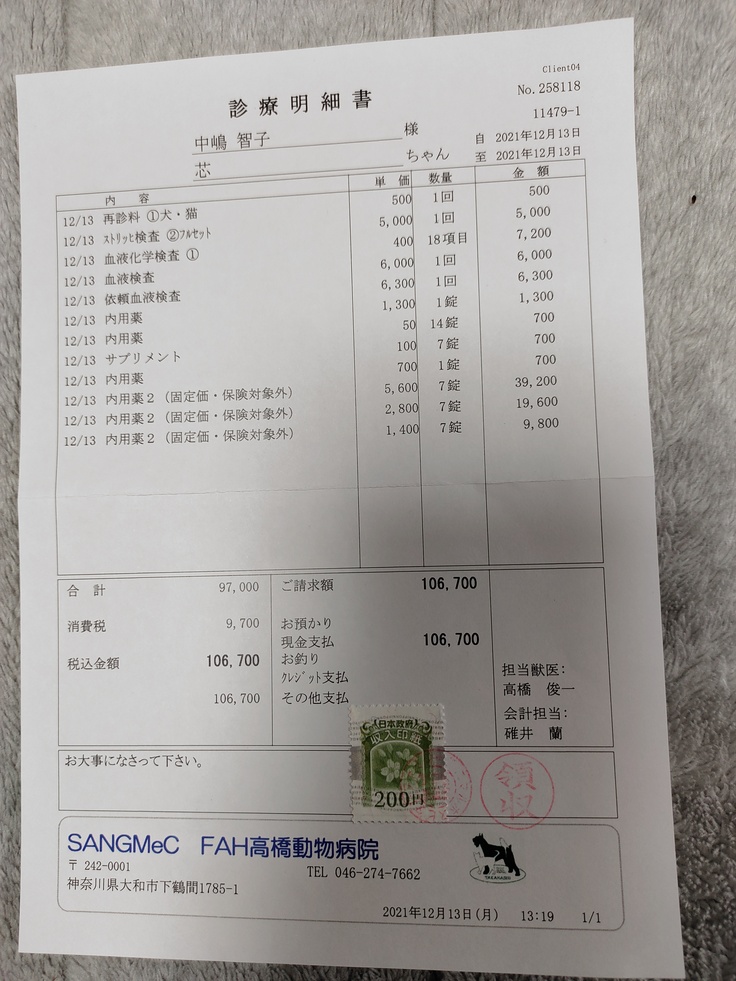 芯の場合、体重2.5kg以下で1日の投与量が400㍉になります。薬は体重増加や、検査結果により投与量が増えていき、毎週200〜250グラムは増えているので、100万円はオーバーする見込みです。