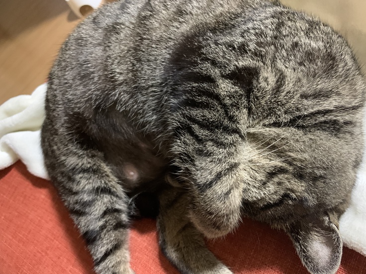 お腹の張りが心配なのと鼻水とくしゃみがでていたので、次の日に病院に連れていきました。先生からは、『お腹が張っているので妊娠している可能性が高いです。飼い主さんが責任を取れないのであれば、お腹の赤ちゃん事子宮を取り出す手術をすることをオススメします。お腹が結構大きいので早めに決断されて下さい。』といわれ、悔しいですが、コロナ禍という事もあり、私には金銭的にコタツを育てる事で手一杯だったので手術をして頂く事になり、2日後に手術を行いました。