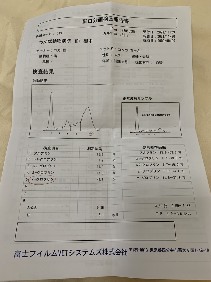 グラフを見ればわかりますが、コタツはグロブリンが異常に高いことからFIPの可能性が90%あると言わました。