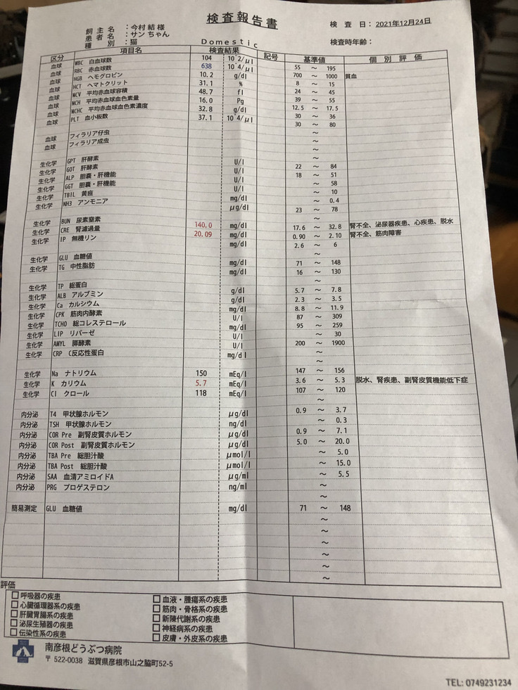 血液検査では、腎臓の正常な数値をはるかに超え、機器では測定できない状態であることと重度の貧血状態であること、貧血状態が高いため点滴で押し出すこともできない、摘出手術は結石が確たる場所にないからリスクが高い、また何よりも腎臓が機能しておらず尿が出ていないことから尿毒症になっているからいつ死んでもおかしくないと言われました。